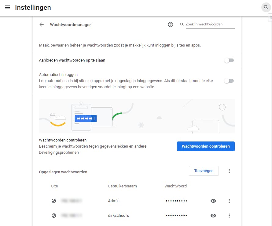 We houden van de eenvoud en de gebruiksvriendelijkheid van de Chrome-wachtwoordmanager, maar er is een belangrijke zaak die je moet weten. Als je niet de enige bent die op de computer met dit gebruikersaccount werkt, dan is dit geen veilige oplossing. Wanneer je huisgenoten op dezelfde computer werken met dezelfde inloggegevens, dan kunnen zij ook jouw wachtwoorden lezen. In dat geval kun je het automatisch wachtwoordbeheer beter uitschakelen. Klik rechtsboven op de drie puntjes en kies Instellingen. Daarna selecteer je Automatisch aanvullen / Wachtwoordmanager. Klik op het schuifje achter Automatisch inloggen en Aanbieden wachtwoorden op te slaan om deze opties uit te schakelen. Daarna kun je de opgeslagen wachtwoorden verwijderen.