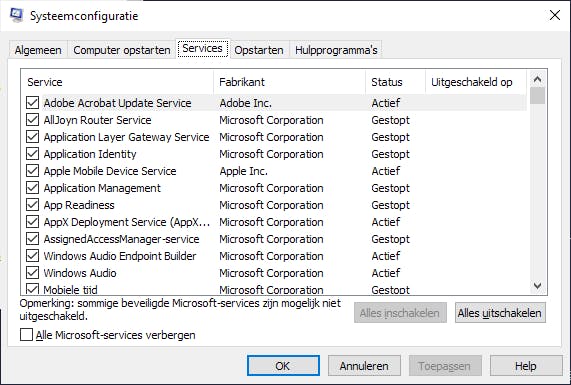 Bij sommige programma’s is het nuttig dat ze automatisch opstarten; denk aan het antivirusprogramma of webcamsoftware. Maar bepaalde apps dringen zich onnodig op in de opstartroutine. Op die manier vreten ze geheugen en processorkracht, en hierdoor kunnen ze de prestaties van de pc belemmeren. Om maar te zwijgen over het onbehaaglijk gevoel dat je krijgt omdat die programma’s hun eigen zin doen. In oudere systemen krijg je de lijst van opstartprogramma’s te zien in het hulpprogramma Systeemconfiguratie. Hiervoor typ je msconfig in het zoekvak van Windows. Daarna gebruik je het tabblad Services om ongewenste processen uit de opstartlijst op non-actief te zetten.