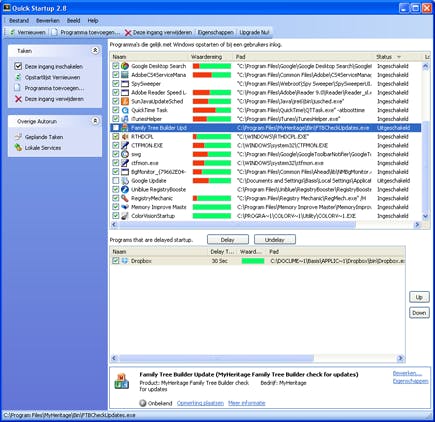 Wanneer u de aan-knop van uw pc indrukt, vertrekt een trein aan programma’s, drivers en services. Ze beïnvloeden niet alleen het opstartproces, maar belasten bovendien de systeembronnen van uw pc. Er bestaan meer manieren om zicht te krijgen op het opstartproces maar met Quick Startup beheert u alles binnen één interface. Eerst krijgt u een lijst van alle bestanden die in actie zijn gekomen bij de laatste Windows-sessie. Naast ieder item verschijnt er een rood-groen gekleurd balk. Hoe groener, des te betrouwbaarder het opstartbestand. Het is dus verstandig om de items na te kijken die behoorlijk in het rood staan. Wanneer u op een item klikt, verschijnt onderaan meer gedetailleerde uitleg over de productnaam en de ontwikkelaar. Nog belangrijker is de betrouwbaarheidfactor. U leest of het bestand betrouwbaar, neutraal, niet vereist of onbetrouwbaar is. Op die manier kunt u het kaf van het koren scheiden. Als u nooit hebt gehoord van het bedrijf of het product en het balkje bovendien erg rood ziet, is de kans erg groot dat u het niet nodig hebt.