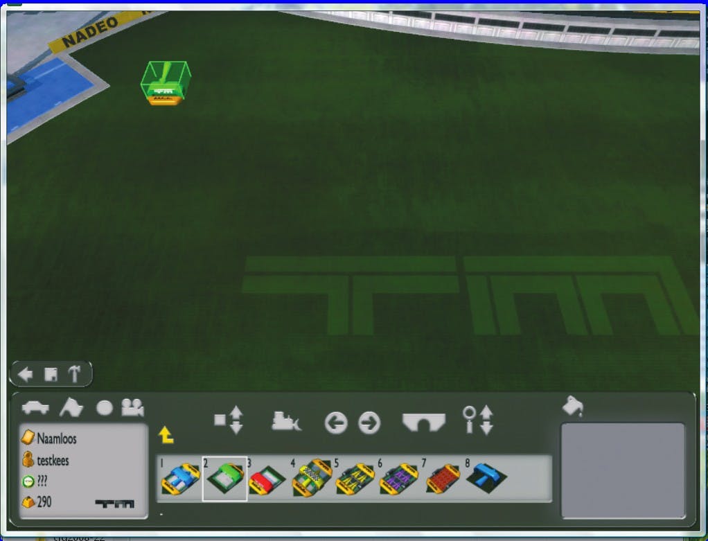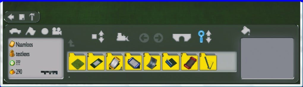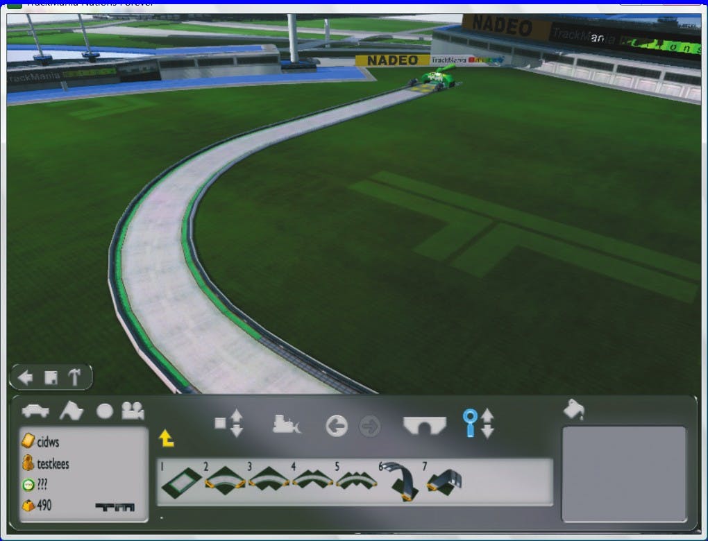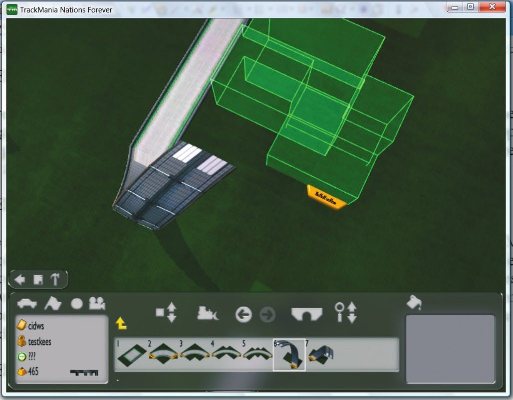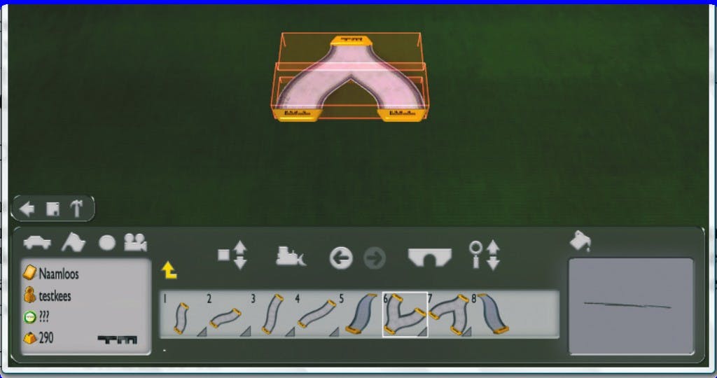 Om meteen lekker op snelheid te komen plaatst u een turboblokje (225) waarvan de pijlen in dezelfde richting wijzen als het startblok. Vervolgens plakt u vijf blokjes gewone asfaltweg (211) gevolgd door een wijde bocht (215). Als deze bij u de verkeerde kant uit gaat, draait u hem weer door te rechtsklikken. Vindt u de blik op de baan niet prettig dan verplaatst u het camerastandpunt met Ctrl+ linkermuis knop. Met Ctrl + rechtermuisknop draait u en met Ctrl+ muiswiel zoomt u in- en uit.