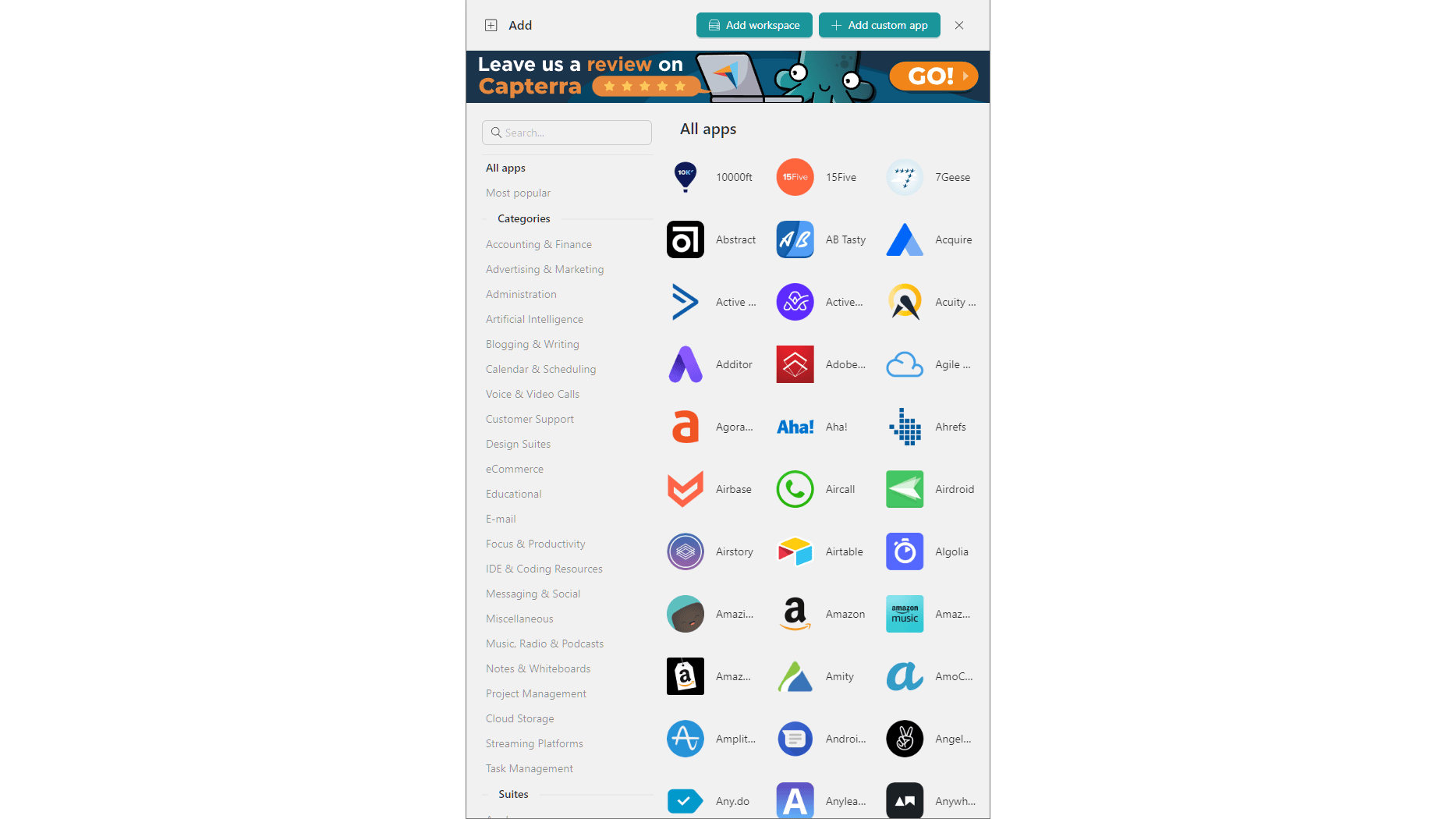 Voor snelle een toegang kun je de zoekbalk gebruiken of apps filteren op categorieën als Artificial Intelligence, Blogging & Writing, Educational, E-mail en nog zo’n twintig andere. Onderaan kun je per suite selecteren (Apple, Google, Microsoft of Zoho). Staat je gewenste webapp niet tussen het uitgebreide aanbod? Dan kun je via de knop +Add custom app (bovenaan) zelf de url invoeren. Zodra je een app selecteert, opent er een apart dialoogvenster waar je specifieke instellingen per app kunt aanpassen.
