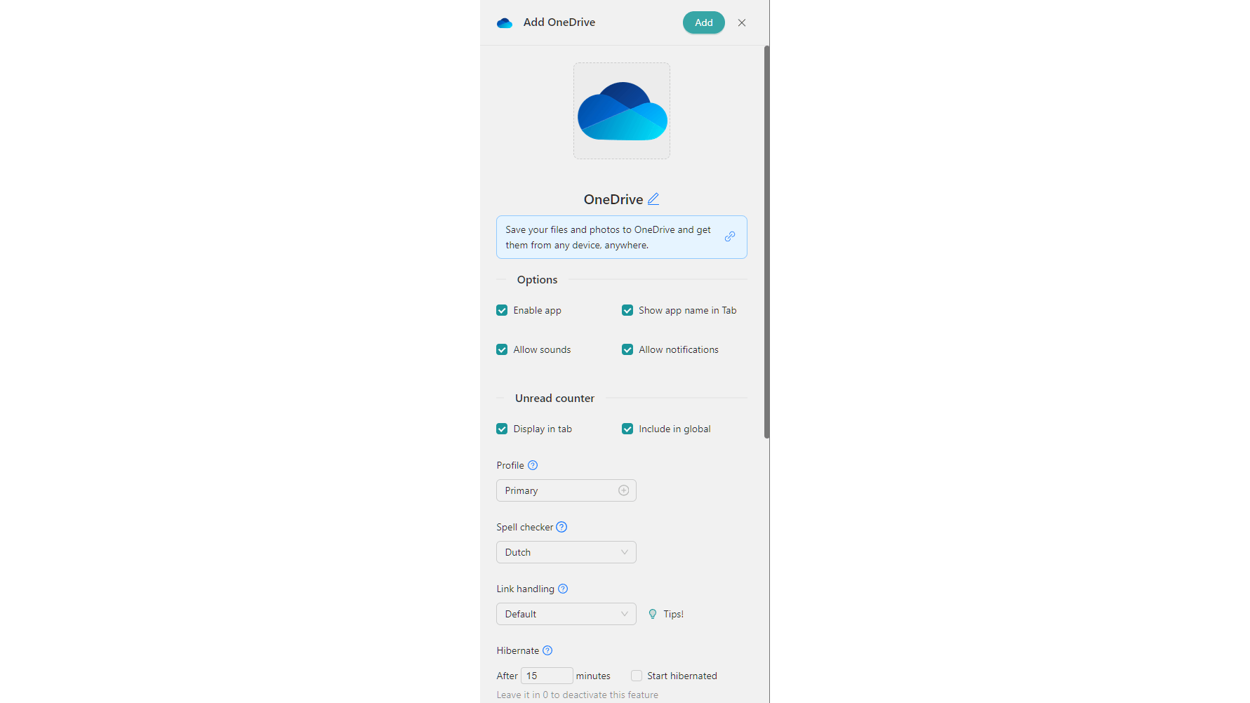 Bij Spell checker stel je de taal bijvoorbeeld in op Dutch. Bij Link handling bepaal je hoe de app op links reageert. Onder Hibernate geef je aan na hoeveel tijd de app in slaapstand gaat om geheugen te besparen (standaard is dit vijftien minuten). Bij Advanced vind je gevorderde opties, zoals eigen code, user agents en proxyconfiguraties, maar daar gaan we nu niet verder op in. Bevestig je instellingen met Add (bovenaan).