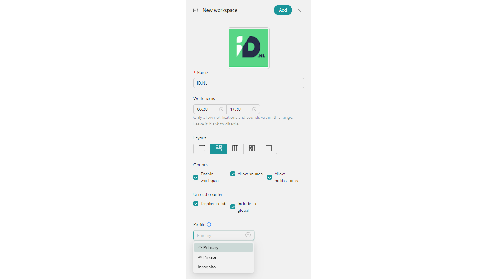 Stel een uurbereik in waarin notificaties en geluiden zijn toegestaan, kies een lay-out en configureer enkele bekende opties voor het toevoegen van apps. Bevestig met Add, waarna (het pictogram van) je werkruimte zichtbaar wordt.