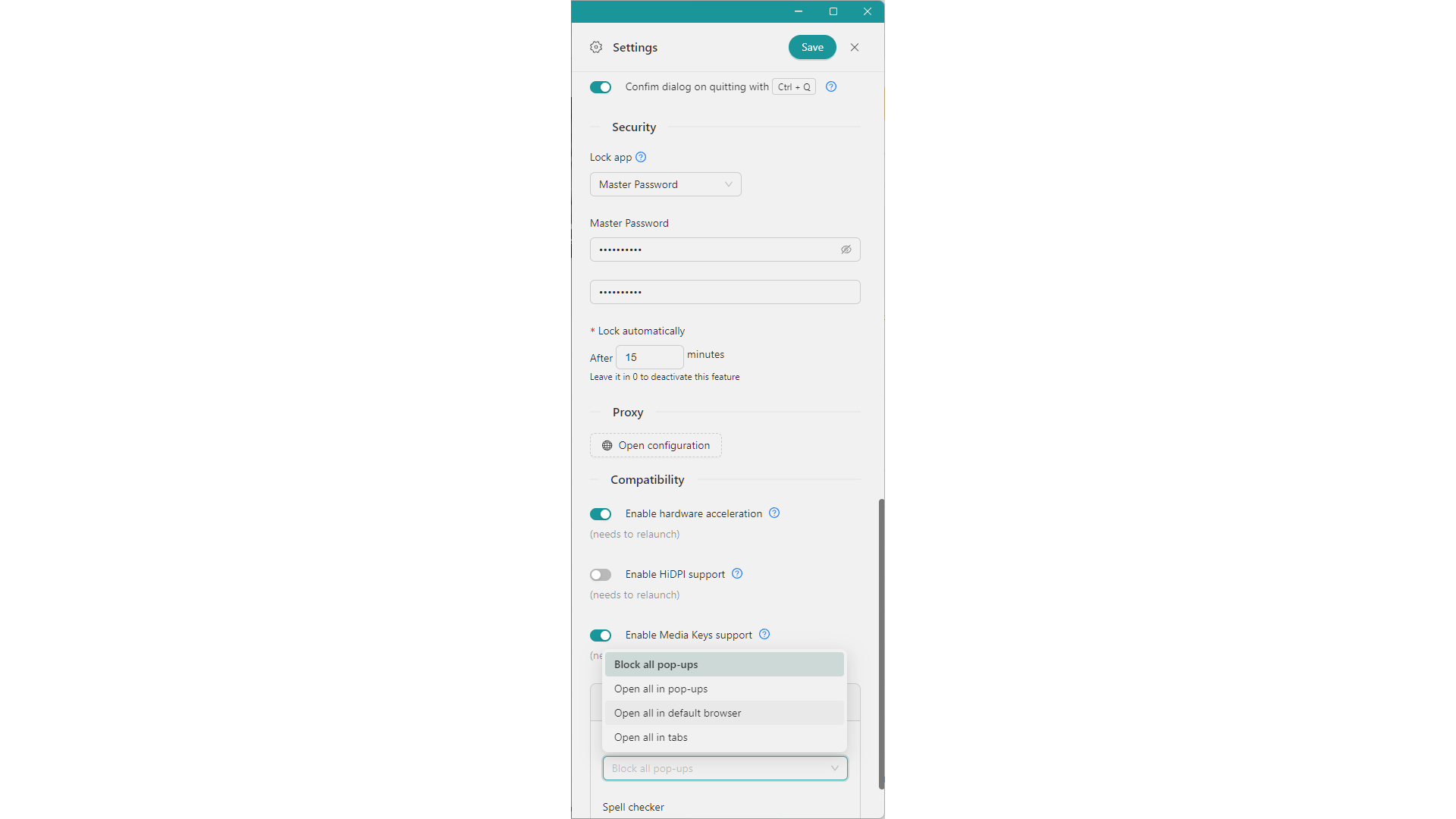 De profielknop biedt toegang tot extra instellingen. Hier kun je ingebouwde sneltoetsen (Shortcuts) in- of uitschakelen en via Settings algemene voorkeuren aanpassen. Denk aan thema’s (zes opties, waaronder Dark), de positie van apps, de standaard-downloadmap, de opstartmodus (zoals automatisch starten met Windows of in de taakbalk blijven), beveiliging (zoals wachtwoord- of Yubikey-vergrendeling) en meer. Met Default app setting stel je de standaard Link handling voor apps in. Bevestig je wijzigingen met Save.