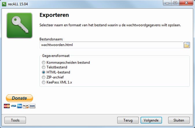 Zodra je de zoektocht hebt gestart, moet je even geduld hebben. recALL speurt namelijk naar alle mogelijke locaties waar een ondersteunde applicatie of dienst (zoals e-mail of ftp) een wachtwoord of code kan hebben opgeslagen. De tool laat hierna de lijst zien met vier kolommen informatie: de naam van de applicatie, het 'type' wachtwoord of code (zoals POP3, online login of Microsoft License), eventueel de inlognaam en het bijhorende wachtwoord. Met een muisklik kun je elke kolom (omgekeerd) alfabetisch sorteren en het is ook mogelijk de zoektocht stop te zetten zodra het gezochte wachtwoord verschijnt. De gevonden wachtwoorden kun je bewaren in diverse formaten, waaronder csv en html.