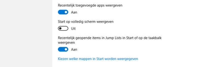 Dat heeft niet altijd iets te maken met het feit dat iemand graag z'n sporen uitwist, al is daar niets mis mee, je hebt nu eenmaal recht op je privacy. Het kan ook gewoon zo zijn dat voortdurend getoonde recente bestanden en locaties zorgen voor onrust in, bijvoorbeeld, Windows Verkenner en dat je graag zo minimalistisch mogelijk werkt. Gelukkig is dit vrij eenvoudig in te stellen Klik op Start en vervolgens op Instellingen. In het menu dat verschijnt klikt je op Persoonlijke instellingen en vervolgens op Start in het linkerdeelvenster. Wanneer je nu helemaal naar onderen scrolt zie je de optie Recentelijk geopende items in Jump Lists in Start of op de taakbalk weergeven. Zet deze schakelaar uit. Eventueel kun je ook nog de opties Meest gebruikte apps weergeven en Recentelijk toegevoegde apps weergeven uitschakelen.