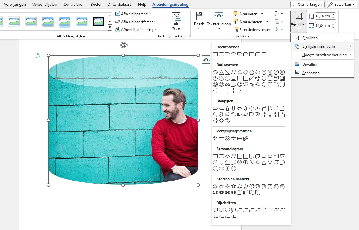We tonen hoe je dit aanpakt in Microsoft Word, maar dit werkt exact hetzelfde in PowerPoint. Voeg een foto toe met het tabblad Invoegen. Daar kies je Afbeeldingen / Dit apparaat en vervolgens navigeer je naar het plaatje dat ergens op de harde schijf staat. Wanneer je de ingevoegde afbeelding op de pagina selecteert, komt er in het Lint een extra tabblad bij: Afbeeldingsindeling. Daar klik je op het pijltje onder de knop Bijsnijden en selecteer je de optie Bijsnijden naar vorm. Selecteer vervolgens een vorm die bij je project past.
