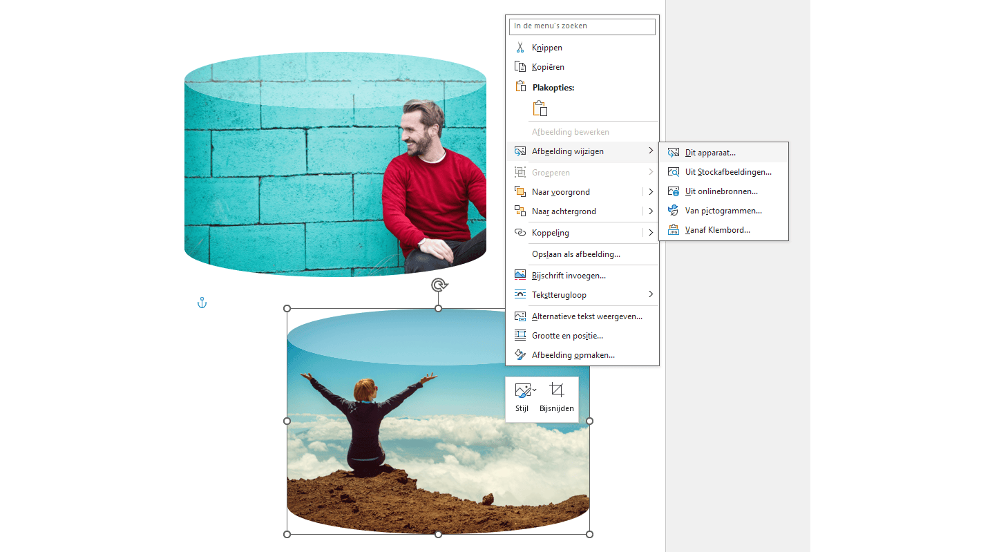 Wil je meerdere afbeeldingen met dezelfde uitsnedevorm gebruiken, dan hoef je daarvoor niet alle handelingen te herhalen. De volgende manier zorgt voor uniformiteit en tijdbesparing. Dupliceer de eerste uitgesneden afbeelding door deze te selecteren en de toetscombinatie Ctrl+D te gebruiken. Positioneer deze gedupliceerde afbeelding waar je ze hebben wilt. Daarna klik je met de rechtermuisknop op de afbeelding en kies je de opdracht Afbeelding wijzigen. Vervolgens selecteer je de nieuwe afbeelding.