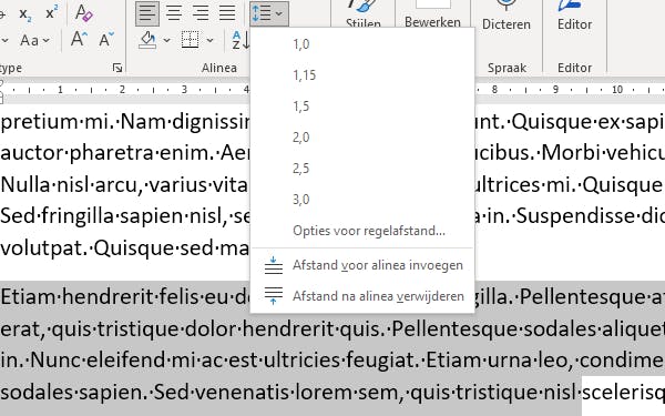 Er zijn verschillende manieren om de afstand tussen de regels in te stellen. De bijna snelste manier is met de knop Regelafstand in de groep Alinea van het tabblad Start. Standaard staat de regelafstand op 1,15 en je kunt die in stapjes vergroten of verkleinen.