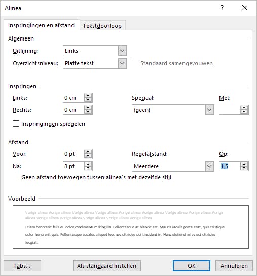 Bij Regelafstand heb je verschillende opties. Selecteer je Enkel, dan vergroot de afstand tussen de regels niet. Kies je Meerdere, dan kun je een soort percentage gebruiken. Geef je hier 1,15 in dan wordt de regelafstand met 15% verhoogd. Bij 2 verdubbelt de regelafstand.