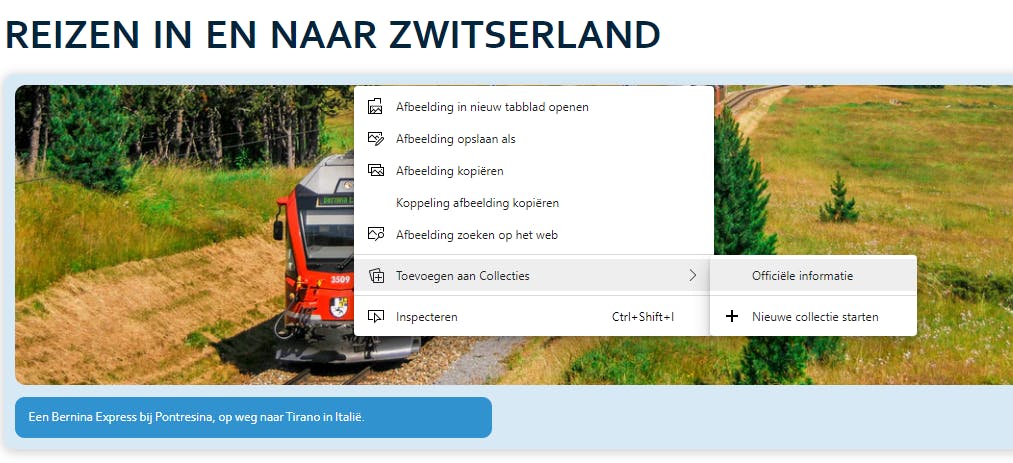Je maakt zoveel collecties aan als je zelf wilt. Denk daarbij aan categorieën of hoofdstukken. Voor onze reis maken we bijvoorbeeld een collectie van hotels, bezienswaardigheden, restaurants, recensies, officiële bezoekerswebsites, Pinterest-bronnen… Eerst open je de zijbalk en daarna gebruik je de knop Nieuwe collectie starten. Die collectie geef je een naam die je later nog kunt wijzigen. Hiermee is de eerste container klaar waarin je webinhoud kunt bewaren. Daarna voeg je de geopende pagina toe die je wilt bewaren via de blauwe link Huidige pagina toevoegen. Je kunt ook gewoon met de rechtermuisknop op de betreffende pagina klikken en daarna uit het contextmenu dezelfde opdracht kiezen. Via de rechtermuisknop toont Edge de inmiddels bestaande collectie(s), zodat je de pagina meteen op de juiste plaats kunt bewaren.