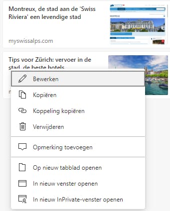 Binnen een collectie kun je op dezelfde manier een of meerdere kaarten selecteren en die verwijderen. In de laatste versie van Edge is het verder mogelijk om de items in een collectie te hernoemen. Daarvoor klik je met de rechtermuisknop op de kaart en ga je naar de opdracht Bewerken. Hierdoor open je het naamvak – zeg maar de titel – van de kaart, zodat je de inhoud kunt aanpassen. Vergeet niet op de knop Opslaan te klikken om deze bewerking te bevestigen. Met de rechtermuisknop open je de webpagina die bij deze kaart hoort in een nieuw tabblad, in een nieuw venster of in een nieuw InPrivate-venster.