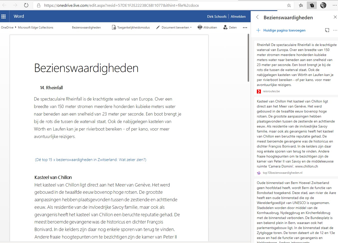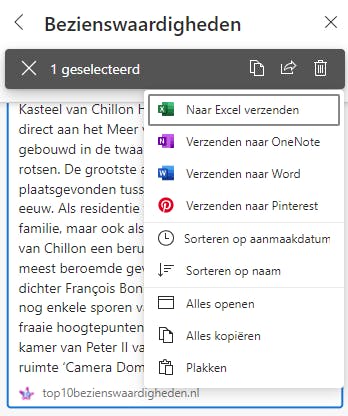 Pas nadat je een of meerdere kaarten hebt geselecteerd, verschijnt de knop Delen in de grijze balk naast het vuilnisbakje. Daar vind je de functie Verzenden naar OneNote waarover we verderop meer vertellen. Je kunt de inhoud van de kaarten ook naar Excel verzenden. Dat is alleen maar nuttig als het gaat om informatie die geschikt is voor weergave in tabellen. Edge exporteert de gegevens naar OneDrive. Er moet dus voldoende opslagruimte vrij zijn. Na enkele tests vonden we het resultaat van de functie Naar Excel verzenden onbetrouwbaar. De functie Verzenden naar Word werkt wel goed. Onze lijst met bezienswaardigheden wordt automatisch in de oorspronkelijk opmaak van de website in een nieuw Word-document verzameld. Dat is handig wanneer de informatie op de kaart erg uitgebreid is geworden en je geen zin hebt om alles één voor één te kopiëren en te plakken. Houd er rekening mee dat de inhoud in Word of Excel niet automatisch wordt vernieuwd. Als je updates wilt publiceren, moet je dat handmatig doen.