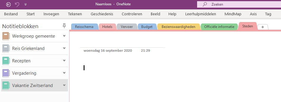 Vakantieplanning stopt niet wanneer je met de koffer in je hand de deur uit stapt. Houd je reisschema fris en deel het met andere vakantiegangers of met thuisblijvers. Nadat je in Edge informatie hebt verzameld, maak je een gepersonaliseerde reisbrochure in OneNote. Dankzij de cloudtechnologie van OneNote is je reisplanning mobiel, net als jij. In OneNote organiseer je alles in notitieblokken, die je kunt vergelijken met het traditionele schrijfblok. Je kunt verschillende notitieblokken maken om vergaderingen voor te bereiden, om recepten te bewaren en natuurlijk om een reis te plannen. Wij maken in dit geval in OneNote het notitieblok Vakantie Zwitserland aan. Handig aan OneNote is de hiërarchische opbouw. Ieder notitieblok bestaat uit tabbladen die we hier secties noemen en iedere sectie bestaat uit pagina’s en subpagina’s.