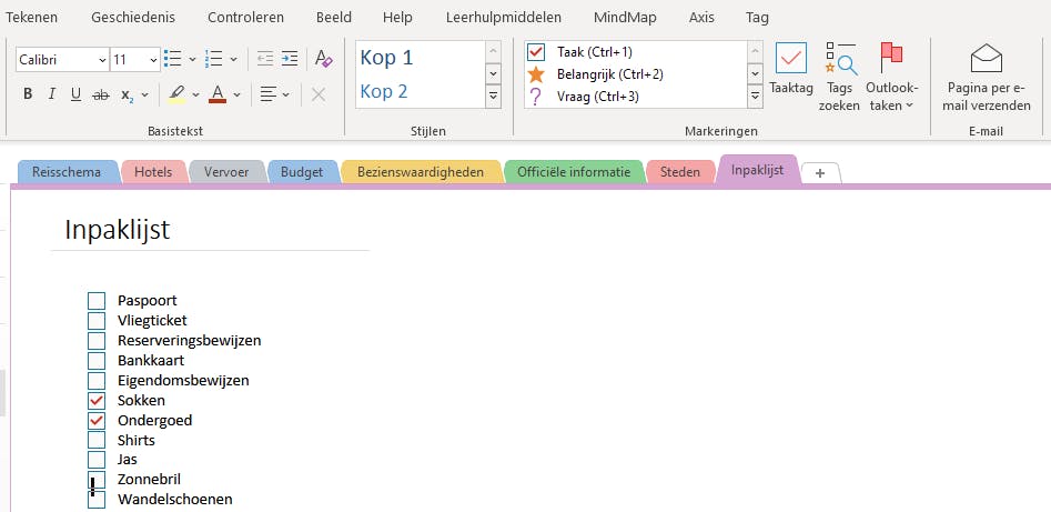 In geen enkele voorbereiding mag een afstreeplijstje ontbreken. Omdat je die maakt in OneNote, kun je in de weken voor je vertrek steeds nieuwe items toevoegen aan de lijst. De dag dat je de koffers inpakt, kun je de items afvinken. Je kunt zo’n lijst gebruiken als to-dolijst of als inpaklijst. Er bestaan verschillende manier om dit te doen, maar de volgende methode werkt volgens ons het snelst. Plaats je cursor daar waar je zo’n lijst wilt beginnen. Daarna typ je de items onder elkaar. Iedere keer gebruik je de Enter-toets om een volgend item in te voeren. Als je denkt dat je klaar bent, selecteer je alle items in het lijstje en ga je naar het tabblad Start. Terwijl de selectie actief is, klik je op de knop Taaktag. Alle items zullen dan een afvinkvakje krijgen. Wil je later nog een item toevoegen, dan zet je de cursor in de lijst en druk je opnieuw op Enter om daarna het nieuwe item te typen. Om je reis-notitieblok te delen met anderen gebruik je de opdracht Bestand / Delen. Je hebt dan twee opties. Kies Delen met anderen om specifieke mensen uit te nodigen via e-mail. Of kies Koppeling voor delen ophalen waarmee je een link ontvangt die je vervolgens naar je reisgenoten of naar het thuisfront kunt sturen.