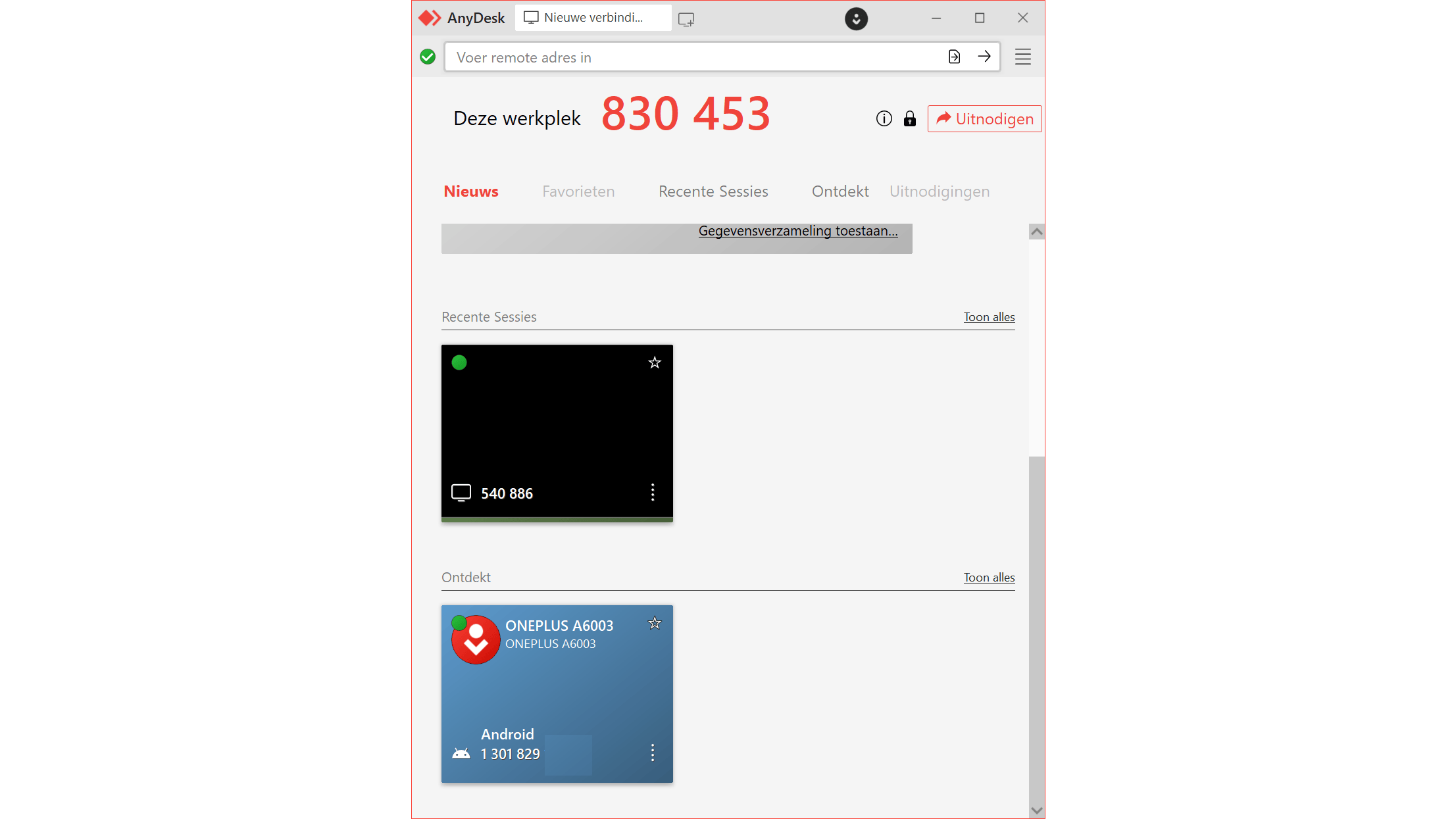 In de sectie Recente Sessies zie je met welke computers je onlangs verbinding hebt gemaakt. De sectie Ontdek geeft apparaten weer waarop AnyDesk is aangetroffen (binnen je netwerk). Dat is handig, omdat je hiermee snel met je andere apparaten een eerste verbinding kunt maken.