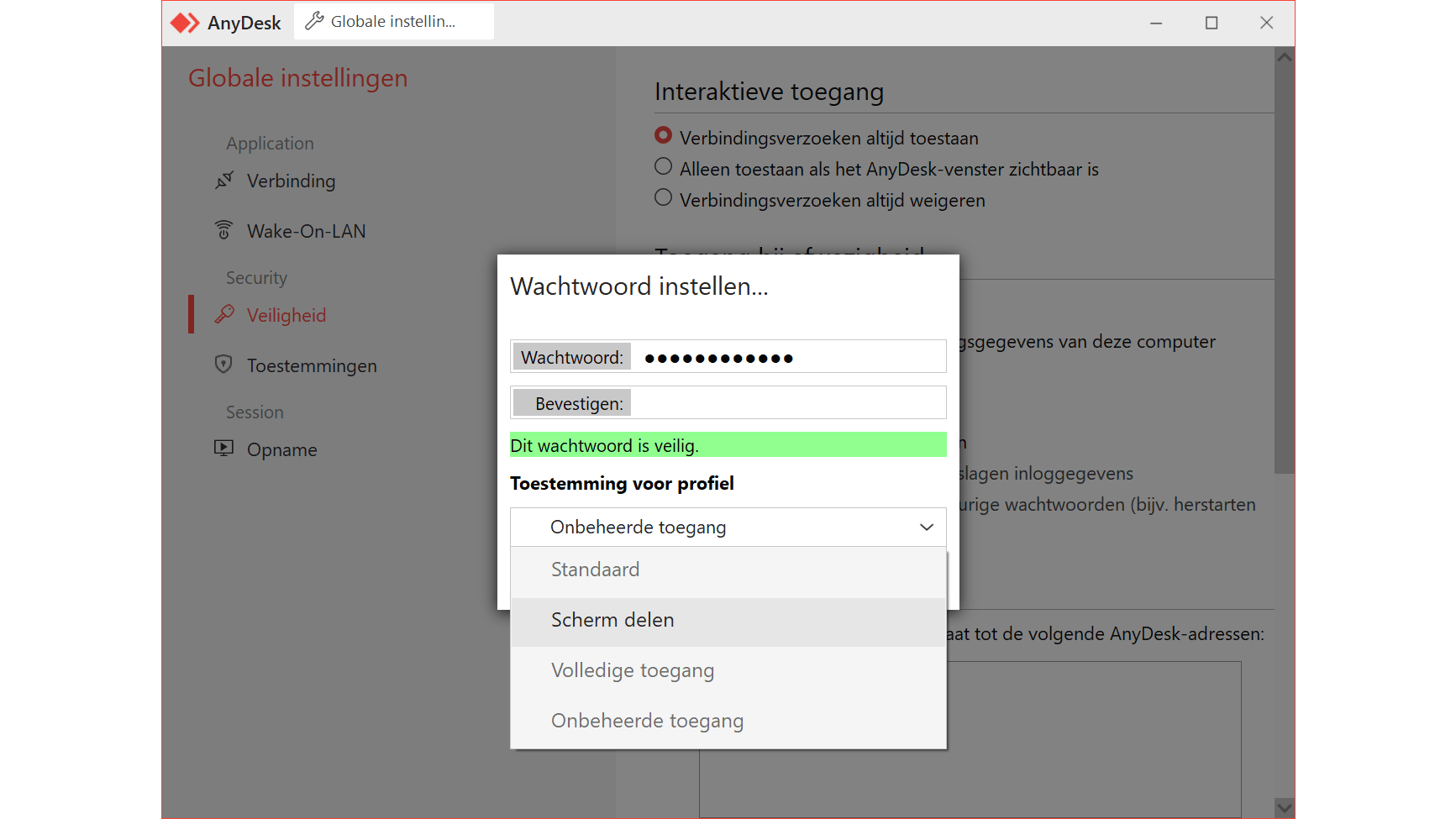 In het vak Toestemming voor profiel geef je aan hoe de computer mag worden benaderd. Via Standaard hebben gebruikers toegang tot alle rechten en kunnen zij de computer op afstand bedienen. Specifieke rechten, zoals het scherm op afstand op zwart zetten, zijn niet toegankelijk. Kies voor Scherm delen als de ander alleen de computer mag zien, maar geen handelingen mag verrichten. Via Volledige toegang hebben externe gebruikers toegang tot de volledige functionaliteit: hier gelden dus geen beperkingen.