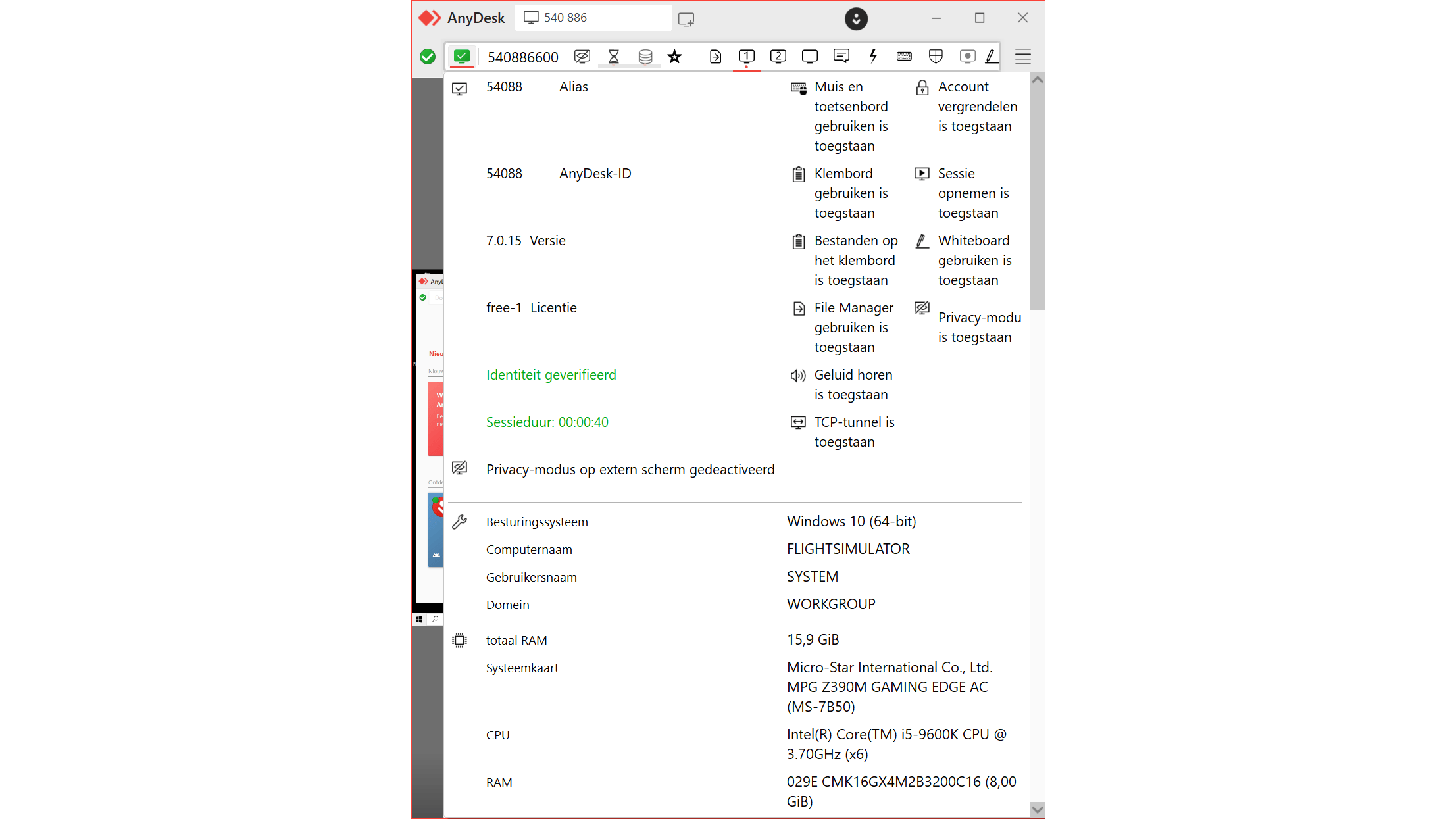 Helemaal bovenin toont AnyDesk bovendien een overzicht van de sessie-instellingen. Je leest hier over welke rechten je beschikt en welke mogelijkheden je mag gebruiken. Bijvoorbeeld of je het klembord mag gebruiken om items te plakken, maar ook of je de bestandsmanager mag inzetten om bestanden over en weer te sturen.