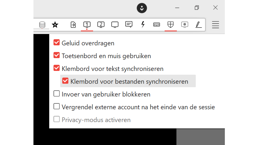 Zit je in een sessie en kom je tot de conclusie dat bepaalde functies missen, omdat je deze voorheen hebt uitgeschakeld of niet eerder nodig hebt gehad? Omdat je de eigenaar bent van de computers in deze thuissituatie, kun je de rechten zelf eenvoudig aanpassen. Tijdens een actieve sessie klik je op de knop Rechten, herkenbaar aan het schild. Vink simpelweg aan waaraan je op dat moment behoefte hebt, bijvoorbeeld Geluid overdragen of Klembord voor tekst synchroniseren.