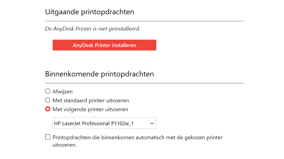 In het instellingenvenster van AnyDesk kies je voor Printer. Klik op AnyDesk Printer installeren. Dit hoef je alleen uit te voeren op de computer op afstand. Op de lokale computer kun je aangeven wat er met de binnenkomende printopdrachten moet gebeuren. Dat is handig, vooral als je meerdere printers hebt aangesloten en wilt bepalen met welke printer de opdracht wordt afgehandeld.