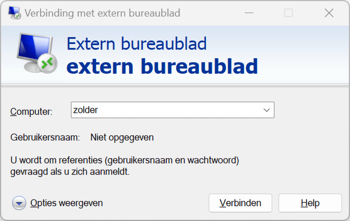 De host-computer (waarmee je wilt verbinden) moet beschikken over de Professional-editie van Windows. De Home-edities kunnen alleen maar verbinding maken en niet als host-computer worden benaderd. Klik op Opties weergeven voor aanvullende instellingen. Zo kun je hier de weergave aanpassen (tab Weergave), aangeven of aangesloten apparaten beschikbaar moeten zijn (tab Lokale bronnen) en de prestaties verbeteren (tab Gebruikerservaring).