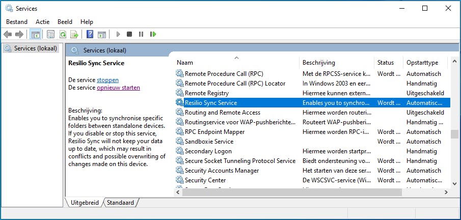 Klik vervolgens op het tandwielpictogram en zet indien nodig in de rubriek General de taal op Nederlands, waarna je de sessie herstart. In de rubriek Web UI kun je de interface afschermen met een Gebruikersnaam en Wachtwoord. Als je de interface ook vanaf een ander netwerktoestel wilt benaderen, verwijder je hier het vinkje bij Sta enkel verbinding toe vanaf dit apparaat. Je moet dan wel nog even de service herstarten: druk op Windows-toets+R en voer services.msc uit. Scrol tot bij Resilio Sync Service en klik linksboven op De service opnieuw starten.