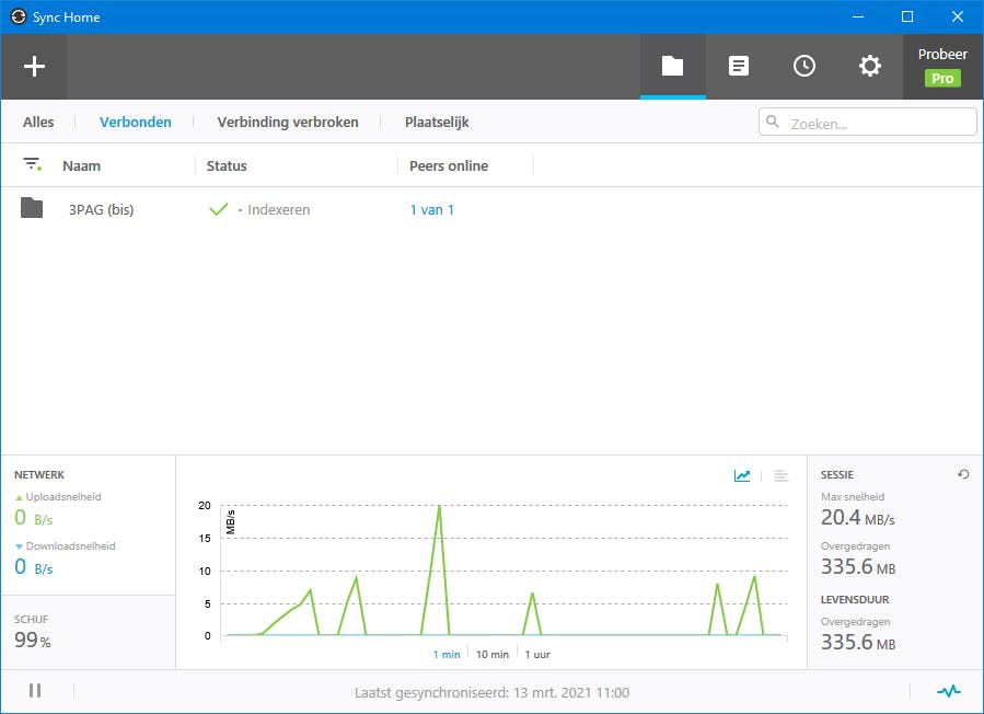 Je kunt de voortgang volgen in het hoofdvenster van Resilio Sync (druk hiervoor op de knop Mappen), zowel op je bron-pc als op de centrale pc. Je krijgt nog meer details over de datatransfer wanneer je rechts onderin op het grafiekpictogram klikt.