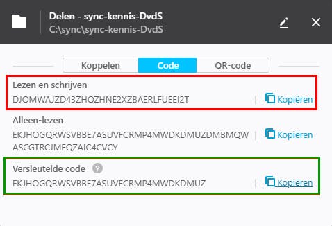 Je dient nu nog op de gewenste desktop of laptop een koppeling naar deze doelmap te maken. Open hiervoor het tabblad Code en klik op Kopiëren naast de code bij Lezen en schrijven. Deze code kun je dan met Ctrl+V in een tekstdocument plakken en bewaren op bijvoorbeeld een usb-stick. Er is ook nog het tabblad QR-code, maar dat is vooral bedoeld om te koppelen met de mobiele app van Resilio Sync.