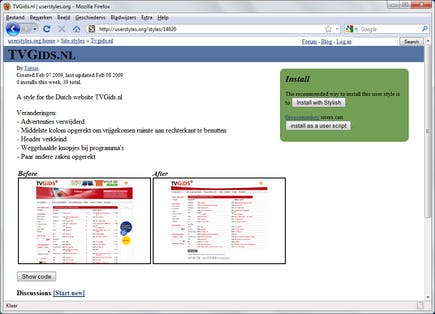Wanneer u Stylish geïnstalleerd hebt in Firefox, krijgt u na de herstart bij elke website onderaan rechts in de statusbalk een icoontje te zien. Opent u het menu en klikt u op Stijlen zoeken voor deze website..., dan brengt de add-on u naar de website userstyles.org en toont u stijlen die anderen voor deze website gemaakt hebben. Hebt u een stijl in de lijst gekozen, dan klikt u op Install with Stylish. Daarna verandert het uiterlijk van de website(s) waarop de stijl van toepassing is.