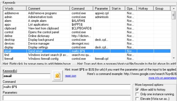 Executor herkent een waslijst aan ingebouwde sleutelwoorden. Met de toetscombinatie Ctrl+S haal je de lijst met sleutelwoorden tevoorschijn die je kunt aanpassen en aanvullen. In een eenvoudig paneel bepaal je welk commando Executor aan welke actie zal koppelen. Het is zelfs mogelijk om hetzelfde sleutelwoord met verschillende opdrachten te verbinden zodat je bijvoorbeeld door 'Actie' te typen in één keer alle toepassingen en mappen opent waarmee je iedere werkdag begint.