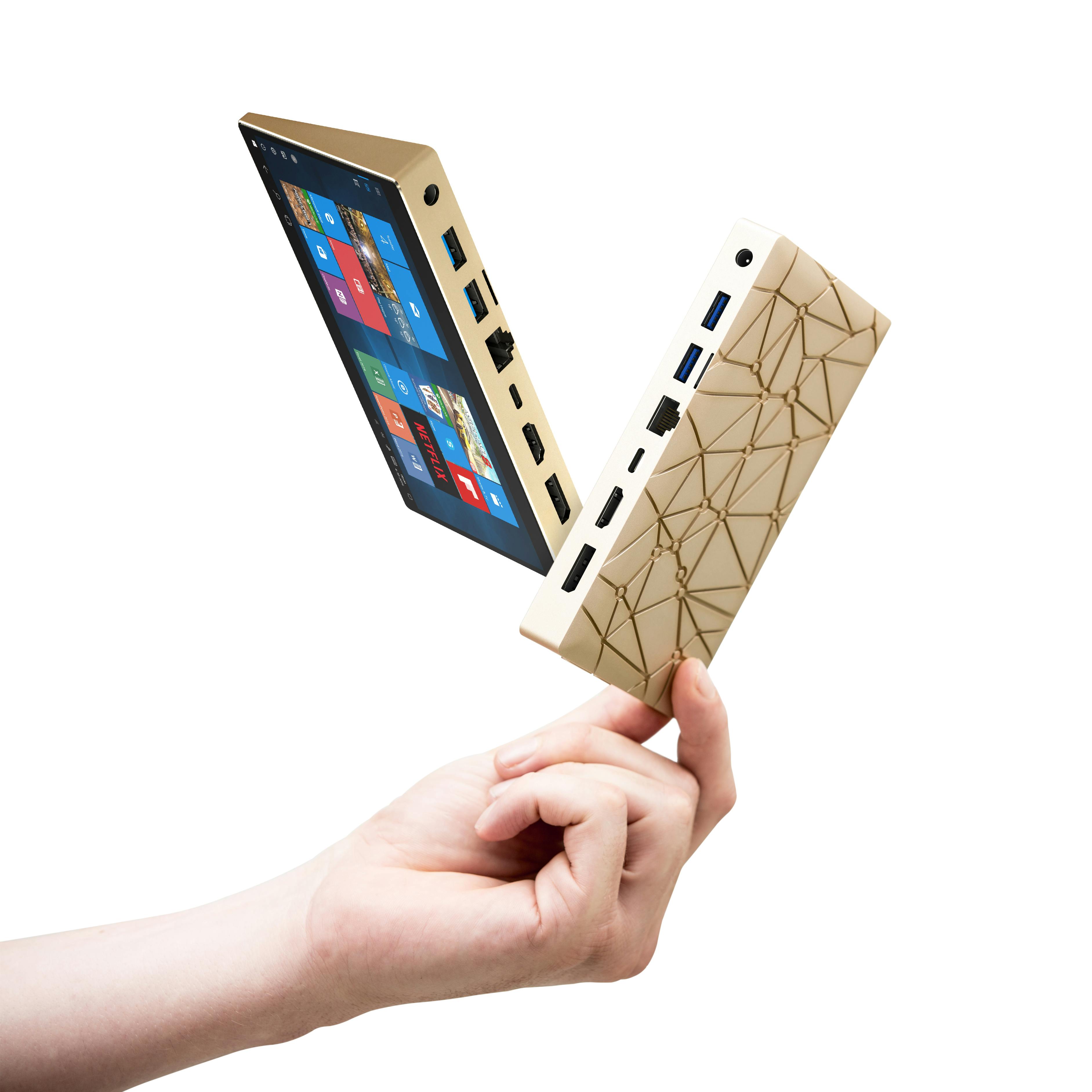 De Ockel Sirius A Pro is een mini-computer die is voorzien van een 6 inch aanraakscherm. Hierdoor kun je het apparaat dus in feite als een mini-tablet gebruiken. Het scherm loopt schuin af, waardoor je het apparaat plat op tafel kunt leggen, en vanuit een redelijke hoek het schermpje kunt bekijken zonder een krampachtige houding. Daar is dus duidelijk over nagedacht. Dankzij het aanraakscherm en door Windows 10 in de tablet-modus te zetten, kun je makkelijk navigeren door de grote tegels van het startmenu en apps gebruiken. De tabletmodus heeft met zo'n klein scherm wel de voorkeur, want als je die niet gebruikt, zijn de meeste Windows 10-pictogrammen toch wel te klein om makkelijk met je vinger te kunnen aanraken. Apps als Neflix of YouTube zijn wel beter te bedienen op het 6-inch scherm.