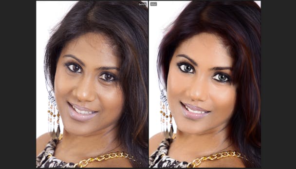 In de volgende stap heeft het programma al automatisch verbeteringen doorgevoerd die vervolgens nog uitgebreid aangepast kunnen worden. De huid is gladgestreken, pukkeltjes zijn verdwenen en tanden en ogen zijn witter geworden. Er is een aantal voorinstellingen die afhankelijk zijn van leeftijd van het model en of het resultaat natuurlijk of 'glamorous' moet worden. Vervolgens kan alles aangepast worden, van de tint van de huid tot en met de haarkleur.