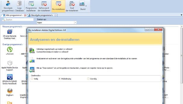 Op het beginscherm tref je een overzicht aan met alle geïnstalleerde toepassingen. Je selecteert een programma en kiest voor De-installeren om alle data weg te gooien. Revo Uninstaller maakt automatisch een registerback-up en herstelpunt aan. Nadat de de-installatie is afgerond, ga je op zoek naar achtergebleven bestanden, mappen en registersleutels. Je hebt hierbij keuze uit drie zoekmethoden, namelijk Veilig, Middelmatig en Grondig.