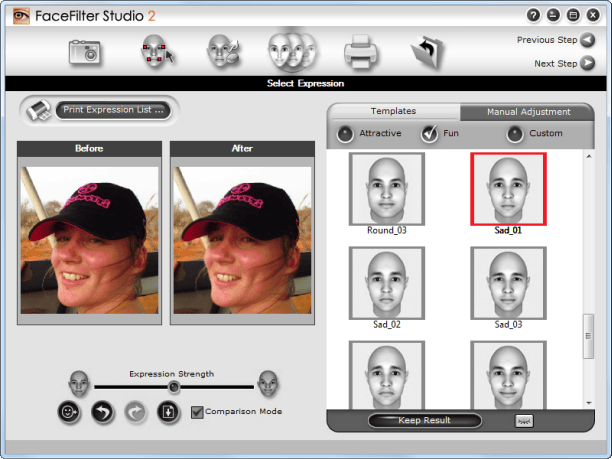 De installatie van dit uitgebreide softwarepakket duurt vrij lang. De reden is hiervoor dat Roxio Creator eigenlijk uit verschillende programma's bestaat. U opent de programma's via menu Start of het centrale startvenster. Aan het startvenster hebben de ontwikkelaars niet gesleuteld, want die ziet er nog precies hetzelfde uit. U kiest met welke media u aan de slag wilt, waarna het softwarepakket relevante toepassingen voorschotelt. Een nieuwe mogelijkheid van Roxio Creator is dat u met het Engelstalige programma FaceFilter Studio 2 portretfoto's kunt bewerken. U werkt via enkele stappen simpel rimpels weg of u kiest voor een andere gelaatsuitdrukking. U selecteert bijvoorbeeld een vrolijk of droevig gezicht. De gereedschappen werken allemaal zonder problemen. Een minpunt is dat er voor FaceFilter Studio 2 een aparte installatie nodig is en een eigen serienummer. Bovendien is het vreemd dat u deze fotobewerker niet vanuit het startvenster kunt openen.