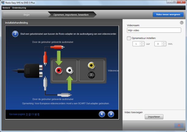 Wanneer u Roxio Easy VHS to DVD 3 Plus aanschaft, krijgt u een schijfje met de software, een usb-opnameapparaat en een SCART-adapter. Voor de ook benodigde tulpstekkers moet u echter zelf zorgen, want deze zitten niet in de doos. Sluit uw videorecorder of camcorder aan op het usb-opnameapparaat en steek deze in een usb-poort van uw pc. Hebt u geen idee hoe u dat precies moet doen? Wanneer u de software start, krijgt u via de Installatiegids duidelijke instructies op uw scherm.
