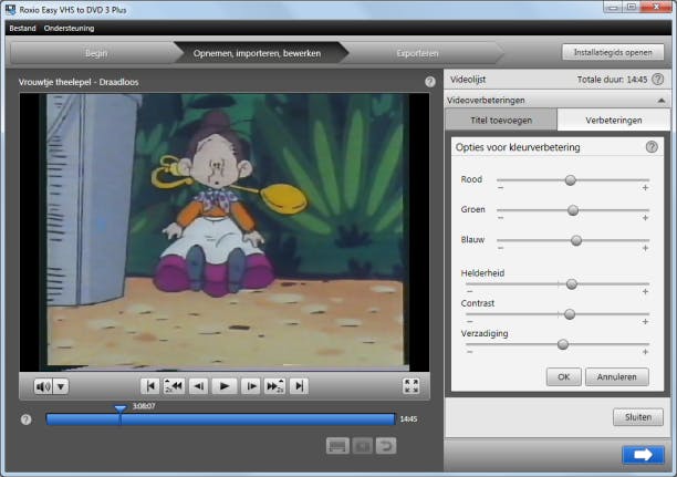 De duidelijke interface zonder al te veel toeters en bellen maakt van Roxio Easy VHS to DVD 3 Plus een gebruiksvriendelijk programma. Om een volledige VHS-band over te zetten op schijf kunt u op DVD opnemen klikken. Wilt u hier en daar losse fragmenten opnemen, dan kiest u Opnemen, bewerken en opslaan. In beide gevallen kunt u het volume aanpassen en de opnamekwaliteit instellen. Via de VHS-speler spoelt u naar het moment waar u de opname wilt starten om vervolgens in het programma op Start opname te klikken. Na het opnemen van de verschillende clips kunt u eventueel nog titels toevoegen. Ruis verwijderen, stabiliseren en kleurcorrecties uitvoeren kan ook. Verwacht hier echter niet te veel van.