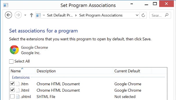 Als hiermee je probleem niet is opgelost, ga naar het Windows Control Panel en klik op Default Programs > Set your default programs en klik op het Google Chrome icoon in het linker paneel.