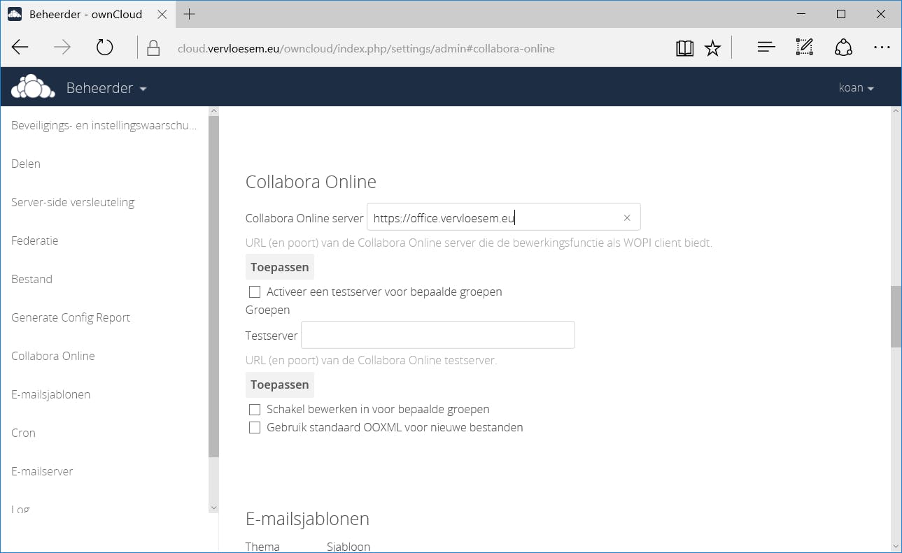 Open dan het beheerdersmenu (klik rechtsboven op de gebruikersnaam en dan Beheerder) en klik links op Collabora Online. Vul dan bij Collabora Online server het subdomein van je LibreOffice Online in, inclusief het prefix https, dus iets als https://office.example.com. Druk daarna op Toepassen.
