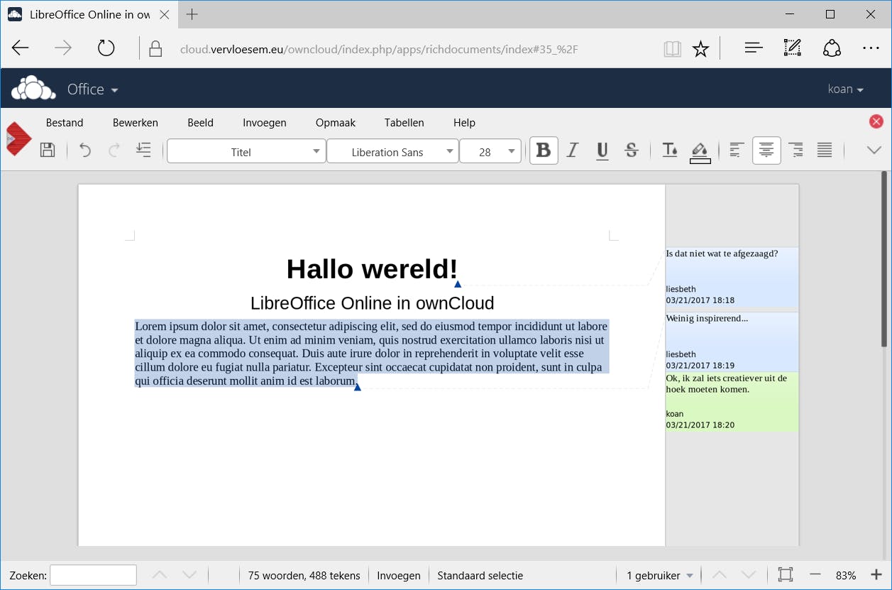 Bovendien zul je zien dat als je klikt op een kantoordocument in je ownCloud-bestanden, het document niet meer lokaal gedownload wordt en op je pc geopend. In de plaats wordt het nu in LibreOffice Online op je server geopend, waar je het niet alleen kunt bekijken, maar ook bewerken.