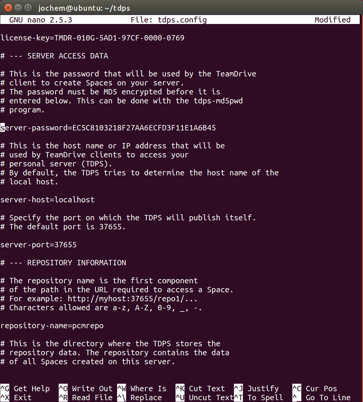 Om de server te installeren, download je de betreffende software voor jouw besturingssysteem. Wij installeren de server op Ubuntu 16.04. Daarvoor scrol je onderaan naar de sectie TeamDrive Personal Server en download je het .tar.gz-bestand. Pak het bestand uit met het commando tar -xvzf TeamDrive*. Ga daarna de TeamDrive-map in met cd tdps. Het is nu als eerste nodig om een wachtwoord, waarmee de data op de server wordt versleuteld, te hashen met md5. Je kunt dat doen met het commando ./tdps-md5pwd je-wachtwoord. Kopieer de md5-hash die je terugkrijgt. Nu is het tijd om het configuratiebestand aan te passen. Daarvoor typ je nano tdps.config. Plak bij server-password= daarachter je md5-hash van net. Je kunt in nano plakken met Ctrl + Shift + V. Vul daarna bij server-host= het IP-adres in van je server of de hostnaam, zonder http ervoor, in. Vul bij repository-name= een naam in van je project en bij repository-path= de locatie waar je de data wilt opslaan. Maak in die map een leeg bestand aan genaamd space-db. Sla daarna het configuratiebestand op met Ctrl + X, Y en Enter om de wijzigingen actief te maken. Om de server te starten, typ je ./tdpsd in de terminal. Je stopt de server met ./stop-tpds. Vervolgens open je een browser en ga je naar http://[ip-adres]:37655/ping.xml. Krijg je dan http-statuscode 200, dan is alles in orde.