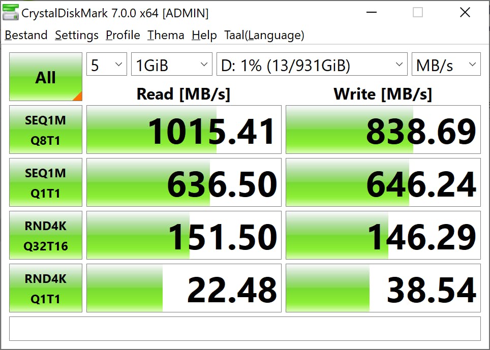 Voor het testen gebruiken we een laptop voorzien van een usb-c-aansluiting die Gen2-snelheden ondersteunt. Voor het achterhalen van de lees- en schrijfsnelheden maken we gebruik van CrystalDiskMark. De resultaten zijn zoals verwacht in lijn met die van de Portable SSD T7 Touch. De maximale leessnelheid bedraagt 1015 MB/s terwijl de maximale schrijfsnelheid piekt op 948 MB/s. Een flink stuk sneller dan voorloper Portable SSD T5 die blijft steken op zo’n 540 MB/s.