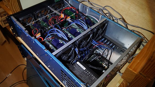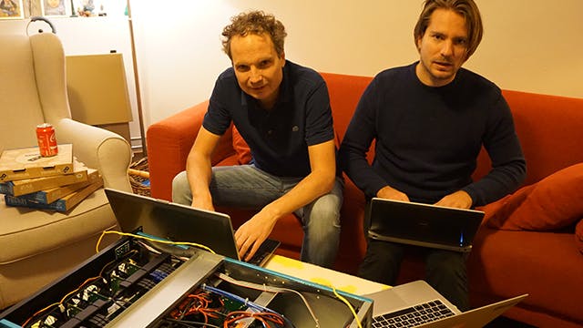 Na twee jaar zoeken kon Van Beek er twaalf overnemen van een Duitser, daarna zagen ze niets meer voorbijkomen. Na jaren wachten dook er laatst een anonieme Tsjech op met meer dan honderd bordjes. “Ik mocht ze niet komen ophalen, hij wilde zijn identiteit niet prijsgeven en ik moest vooraf betalen met bitcoin”, vertelt Van Beek. “Alles wees op een oplichter, maar ik wist zijn identiteit te achterhalen en bestelde tien bordjes. Die waren goed, dus toen kochten Rickey en ik de overgebleven rest ook. Nu bouwen we zelf serieuze kasten met professionele apparatuur met een custom-made behuizing, goede koeling, veel usb-kabels en genoeg ruimte voor veel fpga-bordjes.”
