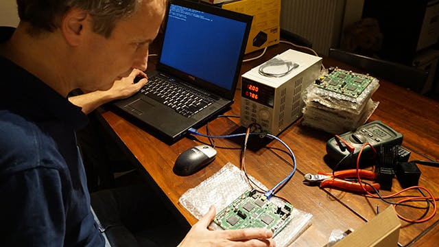 Het kraken gaat via cpu’s (processors), gpu’s (videokaarten) en fpga’s (field-programmable gate array). Over de fpga’s kan Van Beek wel uren praten. Veel compacter dan een high-end videokaart, tien keer zo energiezuinig en ook nog veel sneller voor sommige typen wachtwoordhashes. Wat een vinding. Fpga’s werden jaren geleden gebruikt voor het minen van bitcoins, maar dat gaat nu veelal via betere ASIC-miners. Een stel Russen ontwikkelde wachtwoordkraakalgoritmes specifiek voor fpga’s, die destijds nieuw per stuk 1250 euro exclusief btw kostten maar niet meer leverbaar zijn. Gevers en Van Beek zagen de snelheid van het kraken en wisten: deze bordjes moeten we hebben.