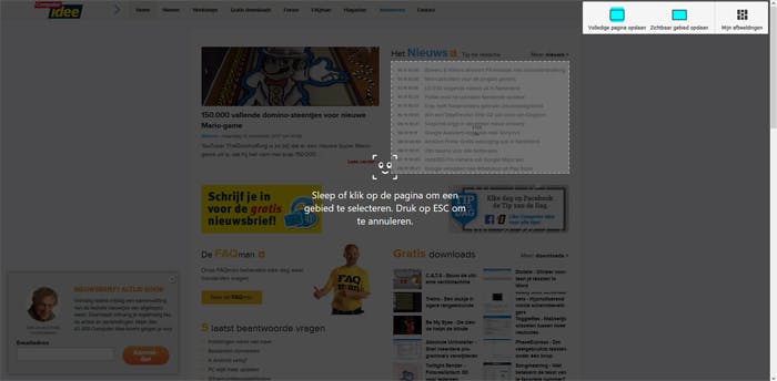 Tijdens het proces zie je bovenin een menu staan. Met Volledige pagina opslaan maak je een schermafdruk van de hele webpagina, ook het deel dat je niet kunt zien zonder te scrollen. Met Zichtbaar gebied opslaan sla je alleen het deel op dat boven die grens te zien is.