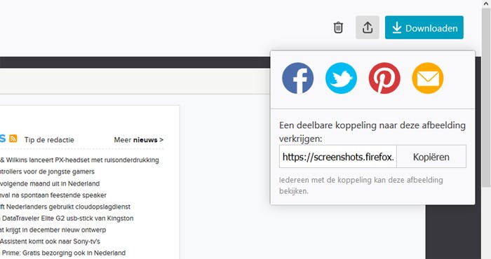 Druk je in het vervolg op de screenshot-knop, dan kun je onderdelen van websites selecteren en er op klikken om een schermafbeelding te maken. Je krijgt vervolgens twee mogelijkheden, Downloaden naar je harde schijf of Opslaan. Bij die laatste optie wordt het beeld maximaal 14 dagen in de cloud bewaard.