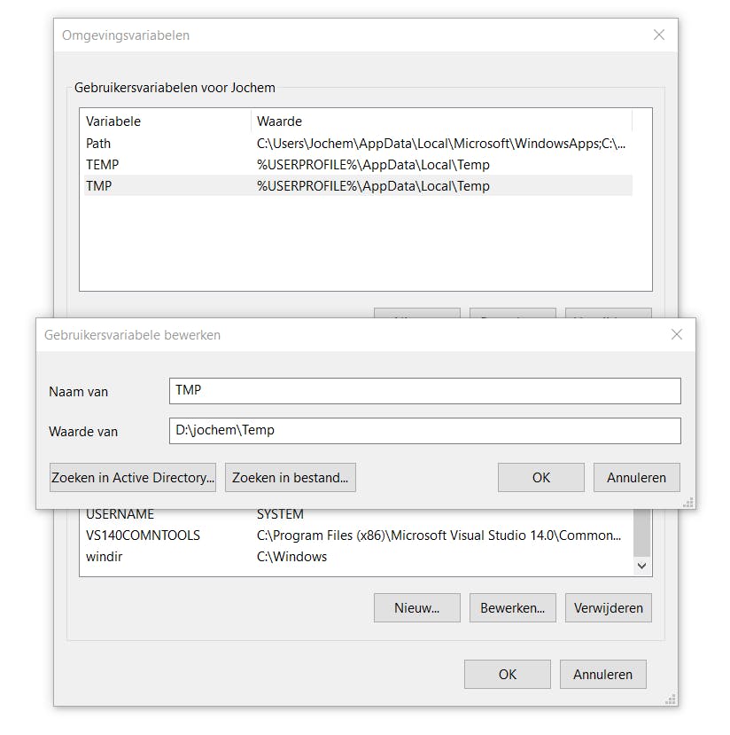 Als je schijfruimte schaars is, wil je dit niet verspillen aan tijdelijke bestanden. Het is mogelijk om de map tijdelijke bestanden te verplaatsen naar een andere schijf met meer schijfruimte. Hiervoor maak je als eerste een nieuwe map aan op je nieuwe schijf, bijvoorbeeld D:\[gebruikersnaam]\Temp. Maak ook een map voor tijdelijke bestanden van het systeem, bijvoorbeeld D:\Temp. Onthoud beide paden. Daarna druk je op de Windows-toets + X en kies je voor Systeem. Ga nu links naar Geavanceerde systeeminstellingen en klik op het tabblad Geavanceerd op de knop Omgevingsvariabelen. Je ziet dan bovenaan bij Gebruikersvariabelen voor [gebruikersnaam] de twee variabelen TEMP en TMP. Selecteer er een en klik op Bewerken en plak het pad van de net aangemaakte map, bijvoorbeeld D:\[gebruikersnaam]\Temp. Doe vervolgens hetzelfde eronder bij Systeemvariabelen en dan ook bij de variabelen TEMP en TMP, maar plak hier het pad van de map voor tijdelijke bestanden van het systeem, dus D:\Temp.
