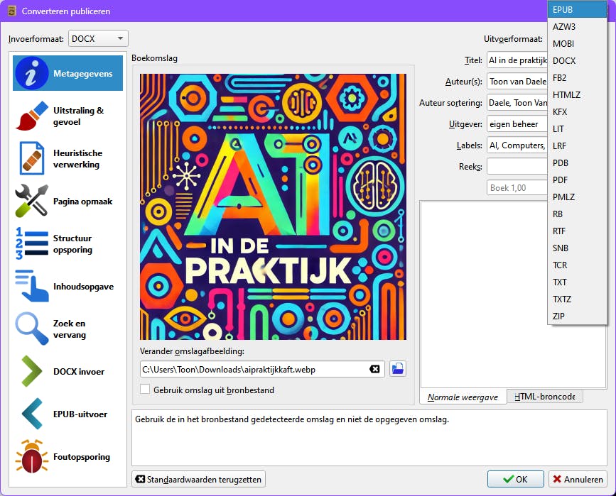 Een ander veelgebruikt e-bookformaat is epub. Om je (Word-)document om te zetten naar epub, kun je de gratis tool Calibre gebruiken. Klik op Boeken toevoegen, selecteer je docx-bestand, klik op Boeken converteren en kies rechtsboven het gewenste uitvoerformaat. Calibre ondersteunt naast EPUB ook formaten als MOBI en AZW3 (voor Kindle-apparaten).
