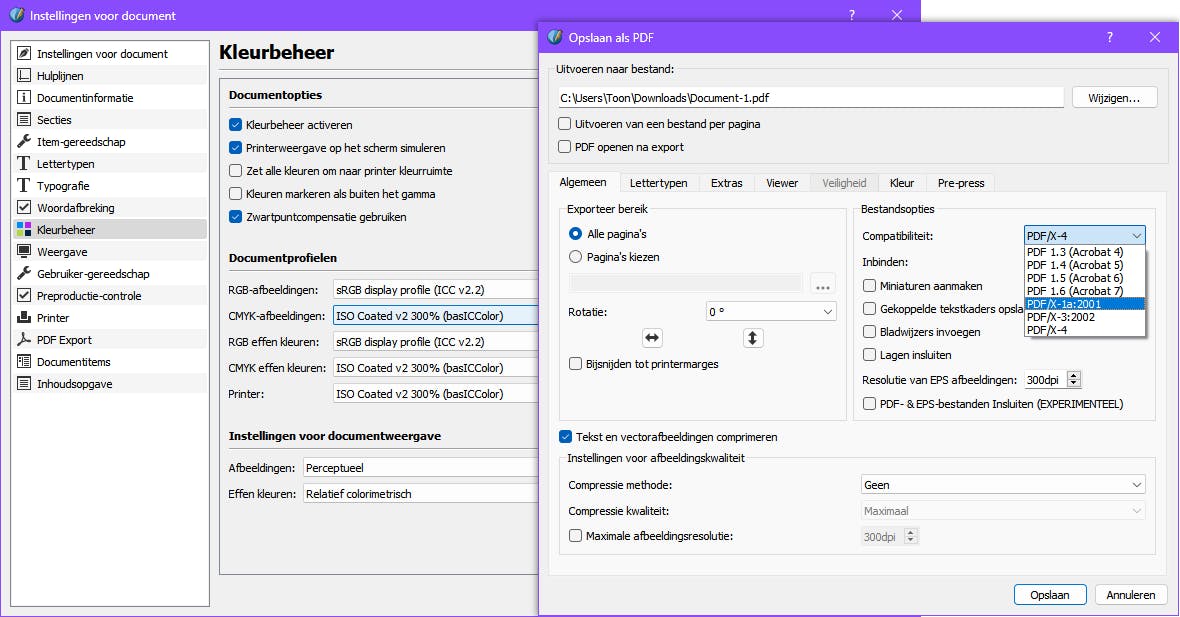 Ook het gratis Scribus heeft uitgebreide pdf-instellingen, in combinatie met het juiste kleurbeheer.