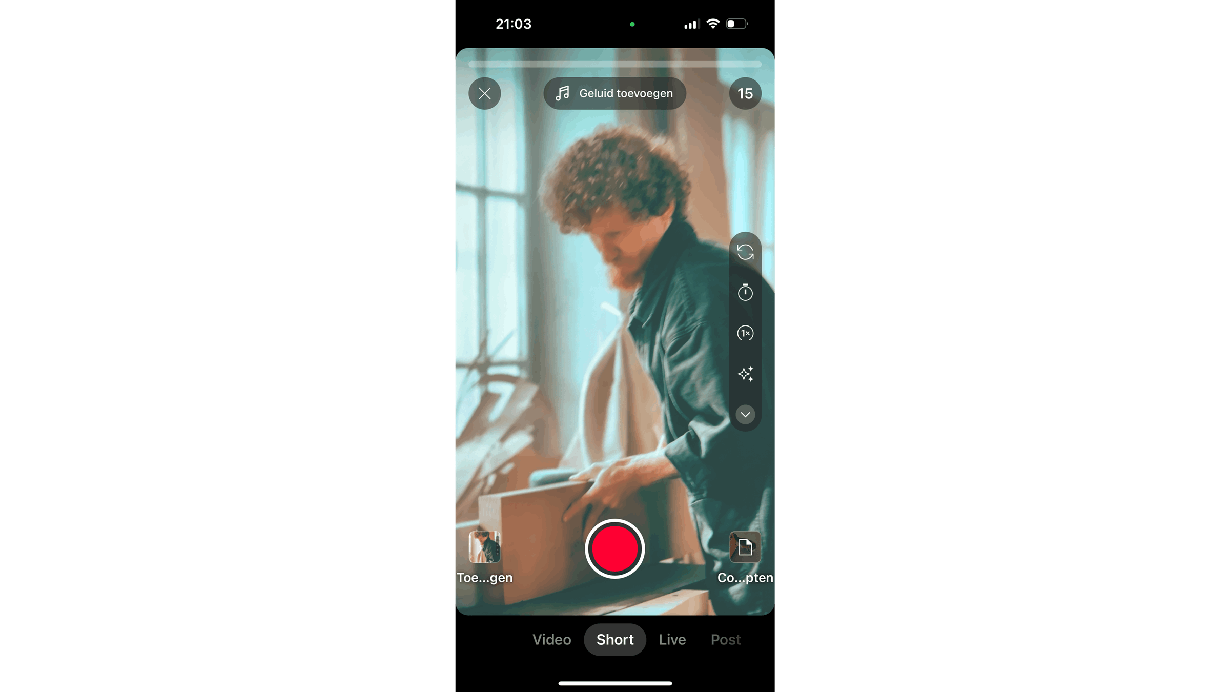 In het opnamescherm zit een set tools ontworpen om de creativiteit en de kwaliteit van de Short te verbeteren. Je kunt de omdraaioptie gebruiken om te schakelen tussen de camera aan de voor- en achterkant. Op die manier is het mogelijk om vlogachtige video’s samen te stellen waarbij je in één korte video verschillende perspectieven toont. Er is ook een timer die je gebruikt bij zelfopnames met een statief.