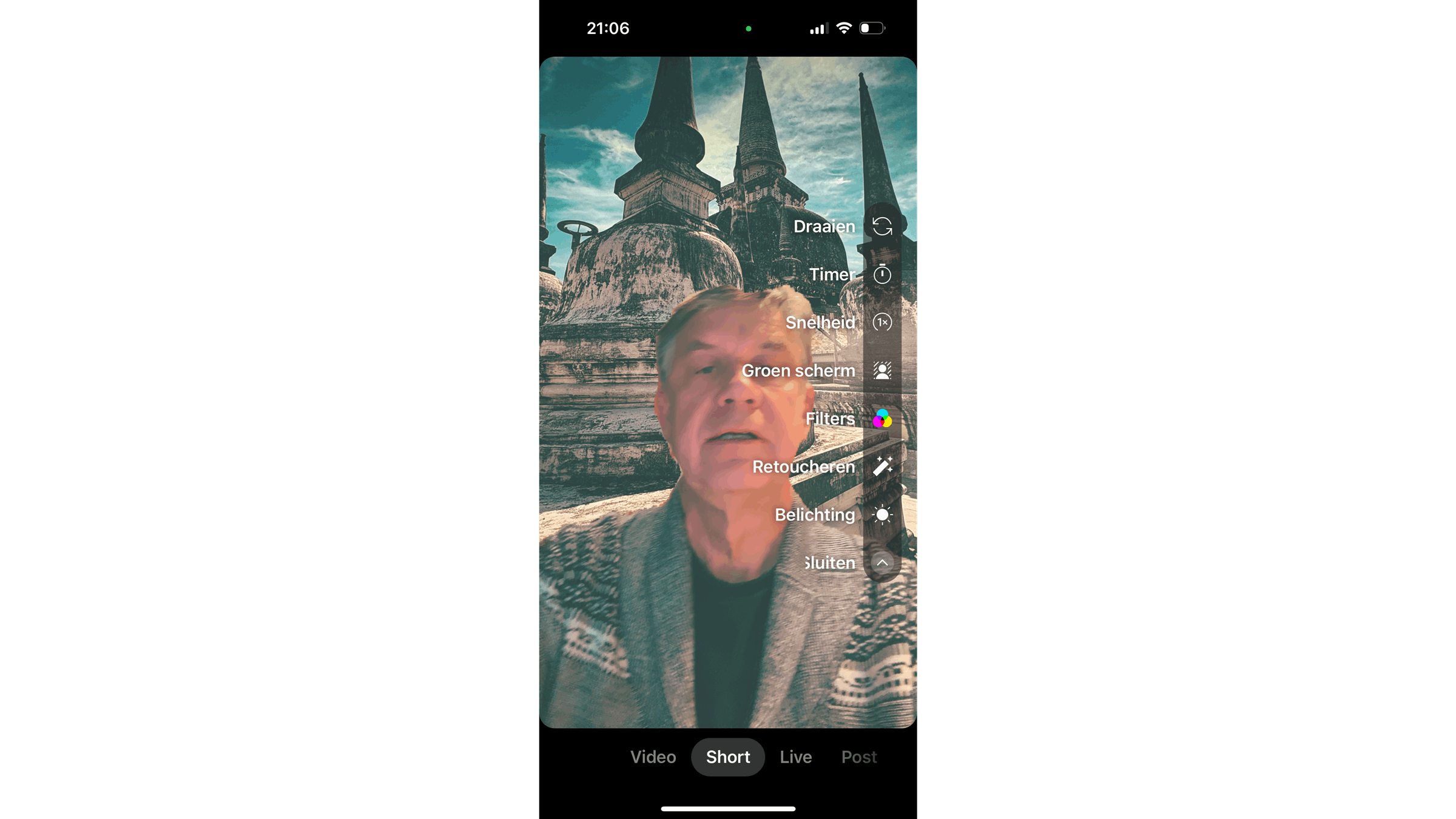 Met Retoucheren pas je digitale make-up toe die rimpels en oogwallen verdoezelt en die tegelijk de kwaliteit van de video verbetert door het frame scherper te maken. Met Verlichting pas je de helderheid aan om de juiste sfeer te creëren. De knop Flits schakelt de flitser van je camera aan en uit. En dan zijn er heel veel filters en effecten zoals bewegingssporen, fisheye-effecten, nachtzicht, allerlei lenzen en achtergronden. Nadat je de gewenste effecten hebt toegevoegd, tik je op het witte vinkje rechtsonder op het scherm.